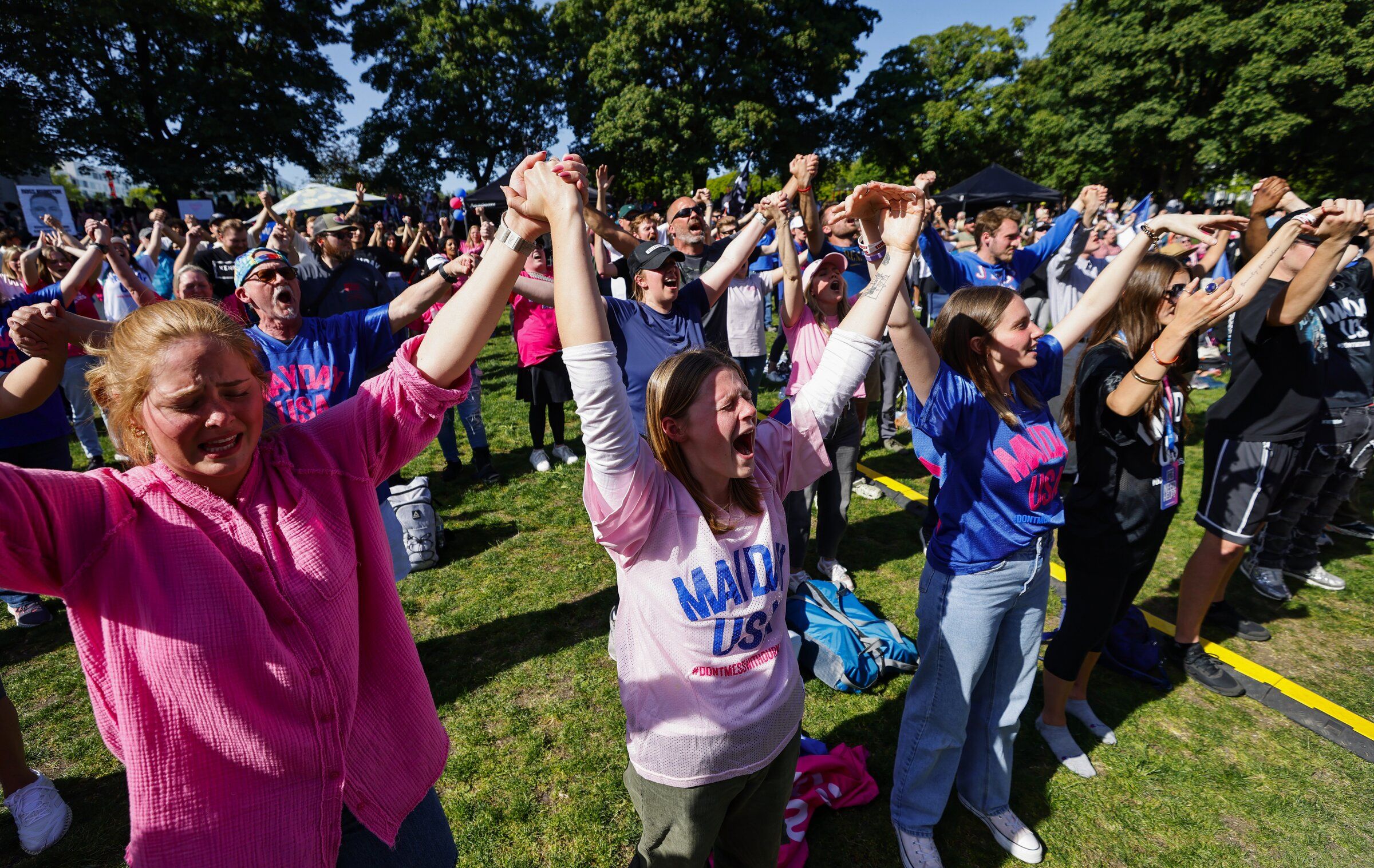 5月24日,在西雅图卡尔·安德森公园举行的“美国五月天家庭节”上,人们齐声祈祷。“美国五月天”节由一家福音派基督教会主办,活动包括现场音乐、祈祷和保守派演讲。(凯伦·杜西/《西雅图时报》)