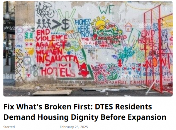 另一方面,署名代表溫哥華東端區居民聯盟(The DTES Residents Coalition)的奧爾德斯(Lee Alders),周二(25日)在網上發起聯署支持議案(下圖),並表示:「我們強烈支持市長提出的議案,暫停溫哥華市投資興建新的社會支援住宅,以優先更換現有的庫存,並促進地區公平性。」