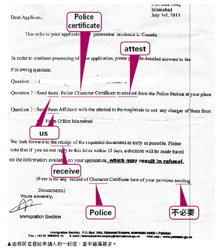 他指出,这封信应该是为了通知申请人,需要向移民官提供无犯罪纪录证明,又称为「警察证明」(Police Certificate),但官员竟将Police Certificate,写成Police Character Certificate,中间多了「character」。