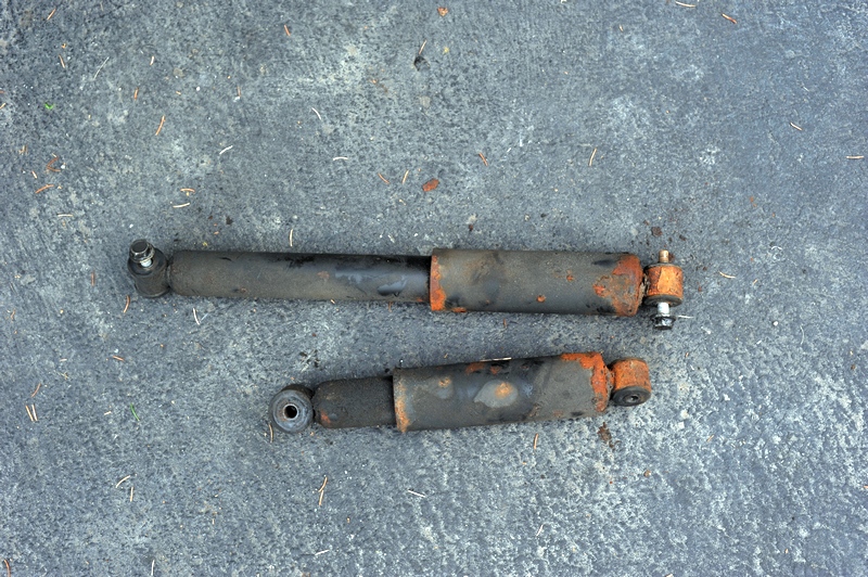 取下来的两个减震,可以看出一个压下去根本都弹不起来了,而且来回拉也很轻松,就是没有功能了,另一侧有些功能,但还是两侧一起换好些,要两侧平衡才好