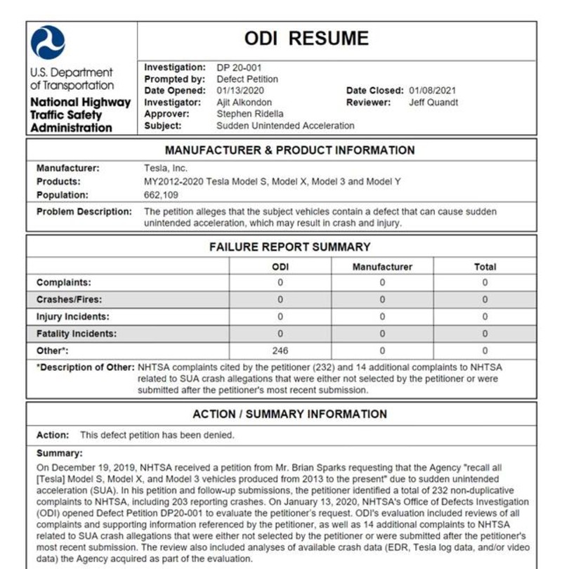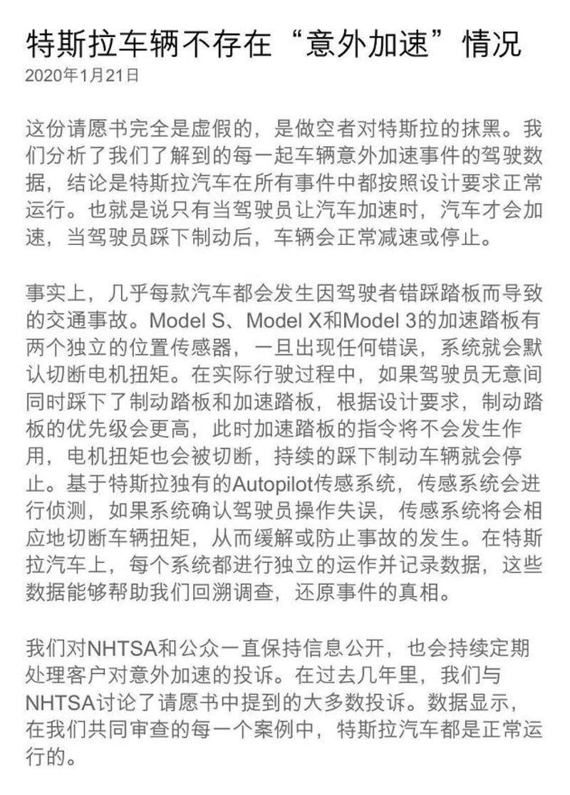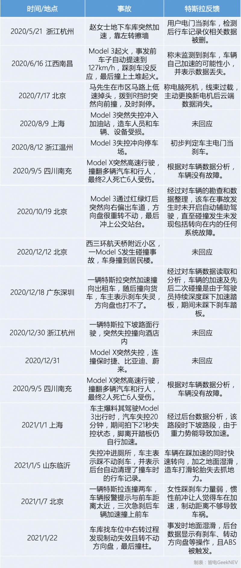 | 汽车失控常见吗,在过去并不常见,对于传统燃油车来说,纯机械结构失控概率并不高,即使失控也多是因为操作失误导致。 而换成电动车后,由于电控的东西比较多,特别是特斯拉这种单一品牌频频“失控”的情况来看,电控的原因就更值得怀疑了。 目前国内对于这些“失控”事故还没有第三方或者相关部门作出权威定性,不过国外针对特斯拉“失控”的调查结果已经率先出炉了,可以参考一二。 ![]() 国内“特斯拉失控”屡上热搜 进入2021年,特斯拉“失控门”是进入了一个高潮,先是河南女车主坐车顶控诉Model 3刹车失灵;再有海南车主曝出Model 3刹车失灵,甚至官方销售亲自上阵也没踩住刹车;而后厦门Model 3在小区失控怼墙的画面又在网上引起热议。 ![]() 河南女车主坐车顶控诉Model 3刹车失灵 ![]() 海南车主曝出Model 3刹车失灵 ![]() 厦门Model 3在小区失控怼墙 根据不完全的统计,从2020年到现在,公开报道的特斯拉“失控”事件已经多达20多起,这些事故具体过程就不一一列举了。 ![]() 按照事故来看,这些事故大多数都有一些相似特点,几乎都是因突然加速、刹车失灵、转向失灵等问题引发事故,并且集中在地库、停车场等地方。 而在事故之后,车辆往往又恢复正常,查不出任何问题。 对于这类“失控”事件,特斯拉的回应都非常统一,车没问题,驾驶员操作失误;部分事故特斯拉甚至是不予以回应。 国外“特斯拉失控”同样上演 国内“特斯拉失控”的新闻是频繁发生,那么这只是国内才会发生吗,答案并不是,在国外”特斯拉失控“事件同样频发。 去年12月9日,韩国首尔一座公寓的停车场也发生了类似的事件,一辆Model X突然“失控”撞向了一堵墙,造成一名乘客死亡,两名乘客受伤。 ![]() 而发生事故最多的还是美国,其中一位Model S车主表示,自己的车子在关闭并锁定的状态下,开始加速驶向街道,撞上了一辆停着的汽车。 另一位车主说自己的Model 3在接近车库门时车子突然向前,撞毁了两个车库门,直到撞到车库的水泥墙时才停下来。 ![]() 由于累计的事故达上百起,因此在2020年年初美国的特斯拉车主更是闹出了“请愿书”一事。 合计127起消费者向NHTSA提交投诉,涉及123辆特斯拉汽车,报告包括110起撞车事故,总共导致52人受伤。 这份请愿书要求美国国家公路交通安全管理局(NHTSA)就特斯拉电动汽车突然意外加速的报告进行正式调查,并要求特斯拉召回50万辆存在隐患的车辆。 面对请愿,特斯拉于2020年1月20日用官网声明给出强硬回应,“特斯拉不会意外加速”,并表示这份请愿书完全是虚假的,是空头的栽赃诋毁,自己愿意积极配合NHTSA的调查。 ![]() 美国调查结果出炉:失控?不存在! 针对特斯拉的多起“失控”事故,美国国家公路交通安全管理局(NHTSA)展开了为期一年的调查分析。 今年1月8日,NHTSA公布了针对246起事故的调查结果,结果也让大家吃惊。 最终报告显示: “凡有数据的事故都有证据表明,意外加速是由于误踩加速踏板引起的。” “没有证据表明,特斯拉的加速踏板、电机控制系统或制动系统存在任何导致事故发生的故障。” “没有证据表明,特斯拉存在容易诱发误踩加速踏板的设计缺陷,关于‘电子设备故障’可能导致‘意外加速’的理论猜测,是基于对系统设计和日志数据的不正确假设。” ![]() 在所有被调查的217起“意外加速”事故中,其中88%的事故发生在停车场、私家车库停车道等非行驶路段的局限区域。 在NHTSA能获得车辆行程数据的118辆特斯拉中,所有数据都显示,特斯拉正常响应了驾驶员的每一个操作,既没有意外加速,也没有刹车失灵。 调查数据还显示:90%的被调查事故中,车主都没有踩下刹车踏板,剩余10%全是在碰撞发生前1秒内才踩下刹车踏板; 另外,97%的被调查事故中,车主都踩下了加速踏板,在事故发生2秒内,甚至将加速踏板深踩到了85%-97%。 全部事故中,约51%的当事人,驾驶特斯拉不到6个月,几乎所有事故均发生得非常快,从发生“意外加速”到发生碰撞,全程不到3秒。 ![]() 也就是说,NHTSA认为,车主误踩加速踏板的不当操作,才是造成所有事故中特斯拉意外加速的原因,因此不会开展进一步全面调查。 质量问题还是人为操作? 针对这样的调查结果,放在国内有没有参考性意义呢,相信是有一定参考性的,但是事情并非绝对,毕竟国内和国外还是有区别。 从事故来看,车主所描述的“失控”主要有两种情况,一是车辆突然加速;另一种则是刹车失灵,我们基于已知的问题进行一些初步分析。 1、特斯拉数据靠谱吗 在绝大多数事故中,特斯拉公布的结果和车主的说法都存在较大的差距,这当中最关键的是特斯拉都没有对外公开数据。 因此这更像是一种单方面的说辞,缺乏足够的说服力,这也是导致大家不相信特斯拉的原因之一。 另外,车辆的信息由特斯拉自行采集记录,数据到底能否真实反馈驾驶情况,能否完全记录,能否实时记录都不得而知。而最终重要的一点是,如何证明其纪录的数据一定由驾驶员操作产生。 例如,车主踩下刹车,但是踩不动,后台是不是就纪录没踩?而车主没踩加速,车辆自动加速,后台是不是也会记录成加速,代表车主在踩加速?因此车载数据记录的可靠性也就存在质疑了。 2、刹车系统会失灵吗? 在前阵子的海南车主刹车失灵的事故来看,大家又将刹车失灵的目光转移到了特斯拉配备的电动助力刹车系统上,认为特斯拉在电动助力刹车