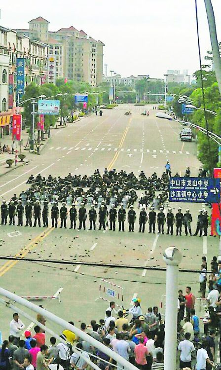 警民昨仍對峙 氣氛緊張 騷亂發生於沙溪鎮豪吐村,網上流傳的起因有兩種版本,一是兩名少年摘取路邊芒果起衝突,另一說法是四川籍少年向本地少年收保護費。中國人權民運信息中心指,涉事少年來自四川,當地警方則指來自重慶。 據人權民運信息中心報道,豪吐村一些少年同四川少年在周一(25日)傍晚發生爭執,村治保會的保安人員將一名13歲四川籍少年反綁雙手,再用袋子罩住頭痛毆,有消息指該少年重傷不省人事。少年父母和大批同鄉前往治保會理論,與治保會人員衝突,附近的外省民工紛紛加入,數千人圍住治保會,人數最多時近萬人。 扔雜物翻警車 傳逾30死傷 當局急調數百警力到場增援,與民工爆發衝突。民工向防暴警察扔磚頭、啤酒瓶和雜物,多輛警車被砸眦或掀翻。中山市亦向當地增援警力,市公安局長更親到現場喊話,人群在昨日凌晨1時許始散去。有消息稱,騷亂共造成30多人受傷,更有消息指有3名四川人和1名湖南人被打死。 本報昨日致電中山市公安局查詢,值班警員表示當地有人鬧事,而非打鬥。根據該局發布的通稿,事件起因是沙溪中心小學一名學生在校門口被一名重慶籍少年毆打,治安員趕到制止時與少年撕扯並將他綑綁,致其面部受傷。 公安:鬧事非打鬥 少年的親友與同鄉其後聚集在村委會外理論,到晚上10時許增至300人,個別人向村委會擲石。警方增派警力控制事態,凌晨3時許群眾陸續散去。 事件到昨日仍未平息,上午8時許,再有近萬名外省民工包圍鎮政府,與上千計警察對峙。警方封鎖鎮內主要街道。網上發放的照片顯示,數十輛被指是運載武警的軍車開進當地,逾百防暴警察排成方陣,封鎖沙溪鎮政府與中心小學附近一條大型街道。 數十軍車入沙溪 封鎖大街 沙溪鎮是著名僑鄉,在海外和港澳台鄉親達8萬多人,近年重點發展休閑服裝生產,在服裝界素有「休閑服裝看沙溪」之美譽。沙溪服裝業吸引近10萬外省工人,較當地戶籍人口6萬人還多。 |