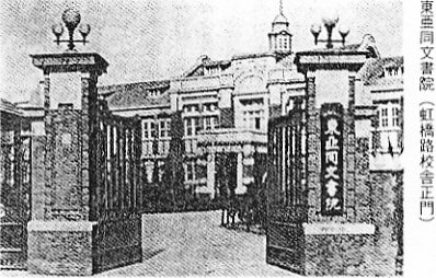 1930年代,上海东亚同文书院,虹桥路校舍正门。照片资料:「山洲根津先生傳」(昭和5年5月10日発行)。山洲根津即日本在华间谍头目根津一,是汉口乐善堂情报网的老牌间谍、上海日清贸易研究所代理所长,直接参加了甲午战争的策划并参战,梁启超与其有联系。日清贸易研究所建于1890年,位于上海南京东路,是东亚同文书院的前身。