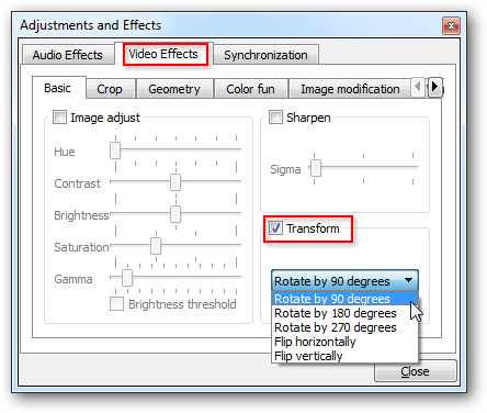 On the Video Effects tab, tick the Transform checkbox and choose your degrees of rotation. The video is rotated counter-clockwise, so to rotate clockwise 90 degrees you’ll want to choose Rotate by 270 degrees. Now you can enjoy your video the way it was intended to be viewed.