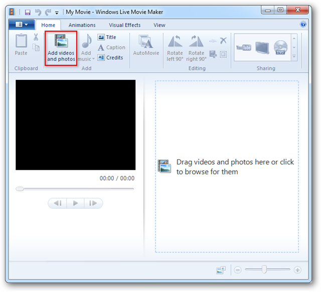 Rotate and Convert the Video with Windows Live Movie Maker Starting with Windows 7, Windows Movie Maker no longer comes pre-installed with the OS. It’s now part of the Windows Live suite that is available as a separate, free download for Windows 7 and Vista. (Windows XP is not supported) You can find the link to our detailed instruction on how to install Windows Live at the end of the article. To add your video files to Windows Movie Maker, click on Add videos and photos on the Home tab, or drag and drop the video into the blank area on the right side of the application.