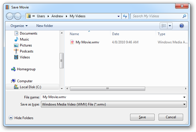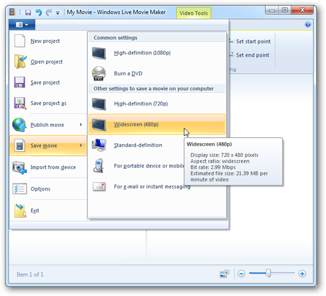 To save and convert your video to WMV format, click the Movie Maker tab just to the left of the Home tab. Hover your cursor over Save movie, and then select your output settings. You also have the option to burn directly to DVD.
