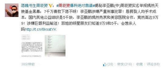 继去年12月,爆料人周筱赟实名举报李亚鹏借公益敛财后,1月6日他再次爆料:“唇腭裂人均手术成本,国内其他公益组织做唇腭裂的手术成本平均5千,而李亚鹏和专业隆胸的整形医院合作,人均手术成本高达9万9!涉嫌巨额利益输送!嫣然天使基金从 2006年至2012年共支出1.1亿善款,而超过60%即7000万善款下落不明! ”全文如下: 李亚鹏不是软饭王,你知道他有多努力吗?他从2010年后不再退出演艺圈,被媒体报道投资均告失败败光王菲一半家产,然后李亚鹏一直在努力做公益,然后李亚鹏就宣称自己比王菲更有钱。 我早说过:在中国,公益就是生意,而且是最赚钱的生意。这就是中国公益可悲的现状。 作为虔诚的佛教徒,王菲无法容忍李亚鹏借公益敛财,坚决与李亚鹏离婚。向王菲致敬!感谢基金会中心网及其理事长徐永光先生为推进基金会财务公开所做的贡献。 ![]() ![]() 周筱赟揭秘李亚鹏嫣然黑幕 感谢至今潜伏在某人身边的内部人士提供的无私帮助! 嫣然至今拒绝公开明细财务报表,周筱赟独家从审计报告枯燥数字中发现天大的秘密——国内其他救治唇腭裂公益组织只和正规公立医院合作,人均手术成本是5千块,而李亚鹏的嫣然热衷和专业隆胸的民营整形医院合作,人均手术成本竟然高达9万9!涉嫌巨额利益输送!嫣然天使基金从2006年至2012年共支出1.1亿善款,超过60%即7000万善款下落不明,李亚鹏涉嫌严重刑事犯罪。 我完全可以想像菲姐的那些明星朋友们知道了9万9和5千之后的愤怒,他们会想杀了李亚鹏的。李亚鹏怎么对得起王菲!怎么对得起菲姐那么多明星朋友捐出的善款!李亚鹏你不怕下地狱吗!我已向民政部实名举报嫣然天使基金7000 万元善款下落不明,请民政部尽快调查。如涉嫌刑事犯罪,请尽快移交司法机关依法处理。 中国公益激浊扬清,就应当从送李亚鹏进牢房开始!本人周筱赟于2013年12月18日发布《周筱赟揭秘李亚鹏(上):民政局纵容下违规注册疑借公益敛财》,这次公布的是中篇(还有下篇哦)。我的爆料一向讲究言必有据,正是确凿的证据和严谨的逻辑,才确保了“周筱赟爆料绝对靠谱”、“一旦出手从不失手”。但出示证据、分析证据不是三言两语能说清楚的。而如今这个碎片化阅读时代,愿意看长文的人不多,所以我先给出本文的结论,有兴趣的读者可以看我的详细分析,或者直接阅读本文最核心的第3部分。 我的结论是:国内其他救治唇腭裂的公益组织的人均手术成本是5千块,而李亚鹏的嫣然热衷和专业隆胸的民营整形医院合作,2012年自己开设嫣然天使儿童医院后,人均唇腭裂手术成本高达9万9!涉嫌巨额利益输送!嫣然天使基金从2006年至2012 年共支出1.1亿善款,超过60%即7000万善款下落不明,李亚鹏涉嫌严重刑事犯罪。 下面就听我详细分析: |