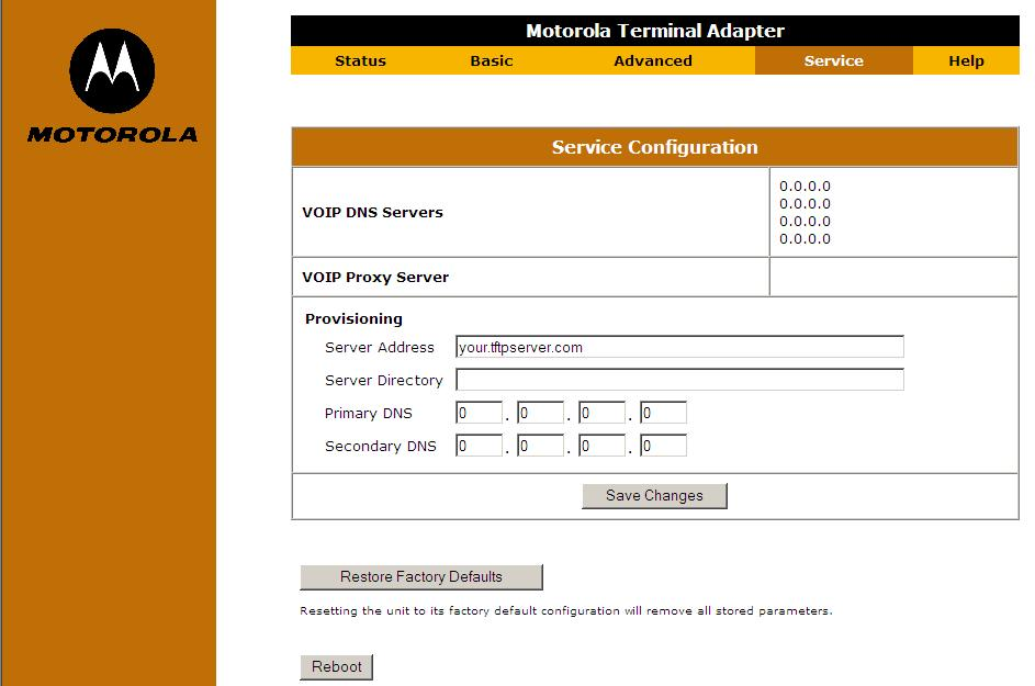 After using any of the above methods, your adapter will be unlocked. Connect a computer to the PC port of your VT and login to 192.168.102.1. You will notice the new Service tab at the top. This is where you should put the IP address or host name of your TFTP server.
