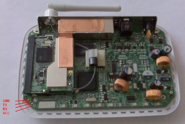Open the router's case and locate the serial console header. Note that no pins are installed, so you need to install your own in order to connect the console cable.