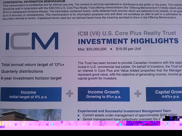 加拿大领先的REIT公司ICM Realty Group前不久推出ICM(VII)U.S. Core Plus Realty Trust信托产品,该产品主要投资于美国二三线有发展潜力的商业地产,信托份额推出以来,十分受人欢迎,于是ICM临时决定明天3月25日晚上六点半在Richmond red star seafood restaurant再举办一场推介会。希望喜欢房地产和房地产信托产品的朋友前来参加。