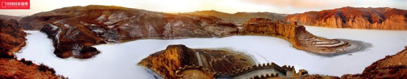 因为少了灌丛树木的遮挡,冬季的老牛湾显得愈发辽阔了一些,结了冰的河道依旧蜿蜒曲折,却比平日平整明亮了许多。安卧在残雪之中的长城,一直延伸到岸边,它和沐浴着夕晖的崖壁以及矗立在崖壁之上的古堡相互呼应着,构筑成一幅油画般的山水胜景。