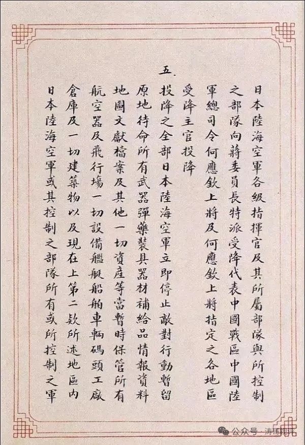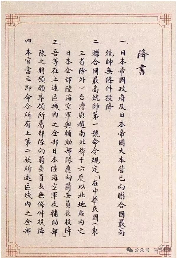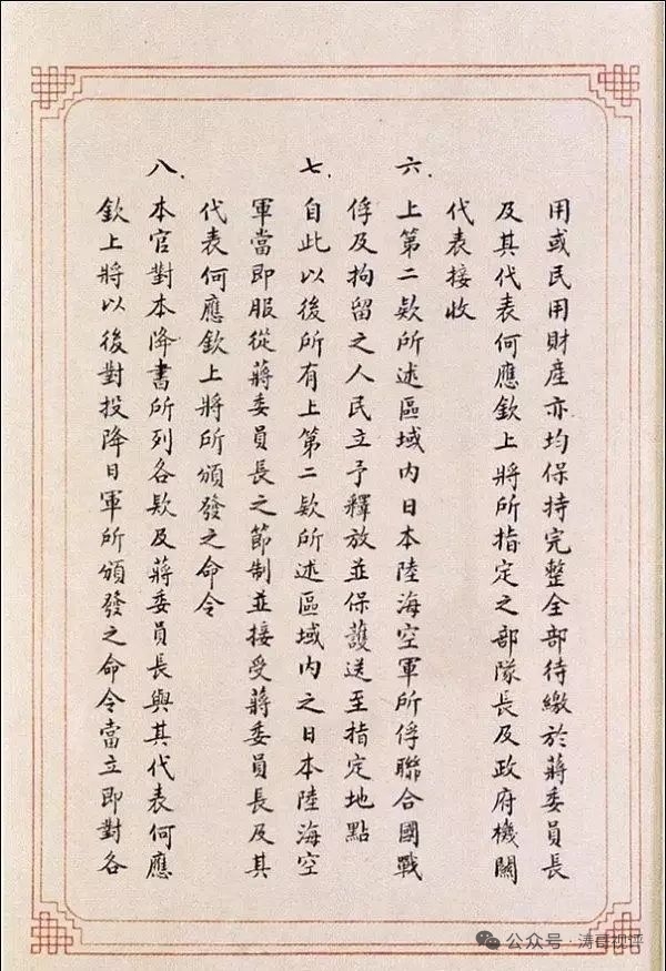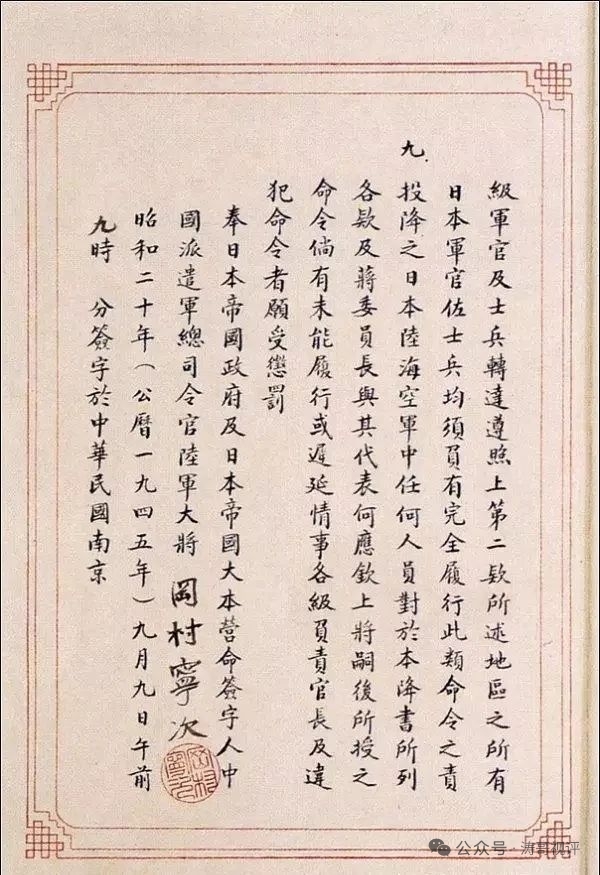 | 《日本投降书》全文如下: 一、日本帝国政府及日本帝国大本营已向联合国最高统帅无条件投降。 二、联合国最高统帅第一号令规定:“在中华民国(东三省除外)台湾与越南北纬十六度以北地区内之日本全部陆海空军与辅助部队应向蒋委员长投降。” 三、吾等在上述区域内之全部日本陆海空军及辅助部队之将领,愿率领所属部队,向蒋委员长无条件投降。 四、本官当立即命令所有上第二款所述区域内之全部日本海陆空军各级指挥官,及其所属部队与所控制之部队,向蒋委员长特派受降代表中国战区中国陆军总司令何应钦上将及何应钦上将指定之各地区受降主官投降。 五、投降之全部日本陆海空军立即停止敌对行动,暂留原地待命。所有武器、弹药、装具、器材、补给品、情报资料、地图、文献档案及其他一切资产等,当暂时保管。所有航空器及飞机场一切设备,舰艇、船舶、车辆、码头、工厂、仓库及一切建筑物,以及现在上第二款所述地区内日本陆海空军或其控制之部队所有或所控制之军用或民用财产,亦均保持完整,全部缴于蒋委员长及其代表何应钦上将所指定之部队长及政府机关代表接收。 六、上第二款所述区域内日本陆海空军所俘联合国战俘及拘留之人民,立予释放,并保护送至指定地点。 七、自此以后,所有上第二款所述区域内之日本陆海空军当即服从蒋委员长之节制,并接受蒋委员长及其代表何应钦上将所颁发之命令。 八、本官对本降书所列各款及蒋委员长与其代表何应钦上将以后对投降日军所颁发之命令,当立即对各级军官及士兵转达遵照。上第二款所述地区之所有日本军官佐士兵,均须负有完全履行此项命令之责。 九、投降之日本陆海空军中任何人员,对于本降书所列各款及蒋委员长与其代表何应钦上将嗣后所授之命令,倘有未能履行或迟延情事,各级负责官长及违反命令者愿受惩罚。 奉日本帝国政府及日本帝国大本营命签字人:中国派遣军总司令官陆军大将冈村宁次 (签字盖章)昭和二十年(公历一九四五年)九月九日午前九时零分签字于中华民国南京。 代表中华民国、美利坚合众国、大不列颠联合王国、苏维埃社会主义共和国联邦并为对日本作战之其他联合之利益接受本降书。 中国战区最高统帅特级上将蒋中正特派代表中国陆军总司令陆军一级上将何应钦。 |