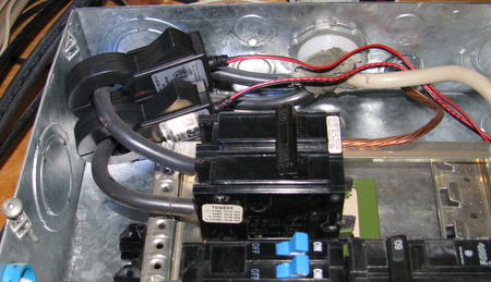 Unfortunately the CTs need to be clipped around the incoming power lines. Thus we must open the top portion of the panel exposing live wires. This is the scary part. You’ll likely standing in the dark with a flashlight, trying to clip these CTs around the two big black wires.