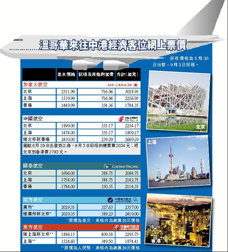 | 往返北京機票破3千元 油價升需求勁 航空旺季提早來臨 【明報專訊】每年暑假及聖誕節均為旅遊旺季,今年的旺季機票價似乎來得特別早,6月底至9月初最貴時段來回溫哥華及北京的機票,目前訂票的票價已突破3000加元,而大部分來回香港的票價也超過2000元。 有旅行社表示,今年暑假各航線往來香港及中國各主要城市的票價,現已突破2000元的關口,較往年同期未到1800元明顯上升。除了因各種附加費用增加外,華人留學生、移民返鄉的需求增長與價格上漲或有關聯,亦有旅行社猜測為航空公司市場策略。 ![]() 溫哥華來往中港經濟客位網上票價 暑假機票多逾2000元 透過各大航空公司的網上報價系統查詢,截至昨日,6月30日自溫哥華出發、回程為9月3日這個最貴時段的機票價錢,加航飛北京連稅及附加費後為3028元,中國航空及國泰飛北京都超過2000元。而飛香港的票價,三間航空公司的價格為1784至2669元,同樣是往年少見的高位(見表)。上述查詢時間來回日都是周末,價格也較貴。 有航空公司主管指,某些航線的票價明顯上漲,除了油價上升增加成本外,亦因有個別公司將航班大減,減少了機位供應,直接影響票價。 開心旅遊負責人陳開心解釋,航空公司廣告中所宣傳的特惠價格機票數量有限、先到先得。她以樓梯級作比喻,當第一級最便宜的機票售罄後,客人便需面對第二級的價錢,如此類推,不過客人仍能選擇有平機票餘下的其他日子。 她表示,今年較多客人提前訂購機票,有不少人現在就預訂9個月後聖誕節的機票,令平價機票一票難求,訂票慢的旅客可能需為旅程支付更多。 對於個別航空公司票價特別昂貴,陳開心指,近年來自內地的移民及留學生人數增加,他們或對某些航空公司情有獨鍾,從而忽略了各間航空公司間的差價,給予了個別航空公司漲價空間。 升勢較往年提早近3個月 有另一家旅行社的主管亦認為現時情況很特殊,強調今年票價的升勢比往年早了約兩、三個月。幾乎全部由溫哥華來往北京及上海的航班票價連稅都已超過2000元。她猜測,票價貴得早或因個別航空公司的票價策略。消費者可能會被提早到來的價格上漲所擾亂,畏懼未來兩個月會有更多人搶購機票,令票價暴升,現時索價1800元的機票看起來相對地「便宜」,而急急搶購機票。如此可能令票價漲得更快,形成惡性循環。 旅客提早搶票推動漲幅 她預測航空公司當銷情轉淡後,可能會推出特平機票,類似情況過往也曾發生。 陳開心提醒旅客,如有意出國,可提早計劃行程,於出發前6至9個月預先訂購機票,通常能得到最實惠的價錢。 她以剛剛過去的春假為例,如客人能早於去年10月訂購機票,會比於今年二、三月才購買節省最少四、五百元。她亦提醒,客人如在網上訂票,價錢可能與旅行社提供的有偏差,而且旅行社可為客人提供更多的服務,例如比較各個航線的價格、更改日期或行程,亦能比較各間航空公司其他細節如行李限制等差異。 |