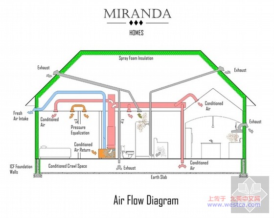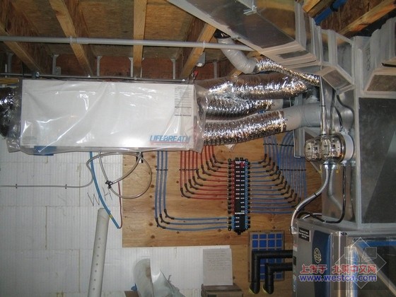 第七节:房屋内部安装 外框屋顶窗门全部围起来后,开始内部安装。 首先按照图纸,穿排电线(包括各开关,灯头盒),电话线,网线, 电视线,保安线,并安装各个分接口盒(你可以预先自己安排每个房间的种类和数量)。所有线路均汇总至地库工程房,在以后安装总的接线面板或主机。 其中电视为二路,一路是有线,一路为卫星。 ![]() 43补充配图:某独立住宅内部,强电、弱电布线,施工现场。 然后是,中央空调(选项),HRV(新鲜空气对换机,选项)和消防水路和喷头(必须)的排管。中央吸尘管路。 (补充说明:HRV Heat Recovery Ventilation热回收通风,ERV Energy recovery ventilation 能量回收通风系统。HRV和 ERV两种系统,虽然名称不同,但工作原理,功能性质基本相近。) ERV能量回收通风系统,能够将预排出室外的室内废气中的热量留住,再使用这个热量加热吸入的新鲜空气,保持住宅内部的热量损失较少。 ![]() 44ERV Energy recovery ventilation 能量回收通风系统工作原理示意图 Fresh Air from Outside 从外面进入新鲜空气 Stale Air to Outside 混浊废气排出 Warm, Stale Air from Inside 从室内混浊空气中吸收温暖热量 Pre heated Fresh Air to Inside 预加热新鲜空气送入室内 ![]() 45补充配图:某住宅中央空调系统示意图 ![]() 46补充配图:某住宅中央空调系统示意图 ![]() 47补充配图:某住宅ERV(Energy recovery ventilation)能量回收通风系统的设备中心区域 最后是地热水管排布,用的是内壁含有一层隔气膜(OXYGEN BARRIER)的红色塑胶管,有印上OXYGUARD的字样在水管上。(以前使用灰色塑胶管材料也是个错误,水内的氯气和氧气容易和水管产生化学作用,使管子变得脆弱老化,减少水管预期使用寿命。而容易渗入空气又对暖机交换器造成氧化腐蚀和堵塞从而会缩短机器使用寿命),水管走蛇型排布,每一层每个部位都经过。排完后就是在上面浇铸水泥,这样就是作好了带辐射暖气的地坪。 ![]() 48补充配图:某住宅地温热水辐射采暖管道布线施工现场 ![]() 49补充配图:某住宅地温热水辐射采暖管道布线之后现场浇注混凝土的施工现场 二天后开始安装保温层。上灰板(包括天花和墙壁)。上灰板前需经过市政厅的再次检查,包括各类管路电线排布,保温层材料厚度和用量等。 ![]() 50补充配图:某住宅室内,木结构框架墙体内部,填充玻璃纤维保温毡毯,外侧钉设纸面石膏板。 安装木窗框。 本节已核准费用: 电线,电视线,网线,以及所有连接盒,(材料和人工,下同)12,000.00 中央空调, 7,500.00 中央吸尘, 3,500.00 HRV, 4,500.00 消防水路, 3400.00 地热系统, 20,000.00 水泥地坪, 2,100.00 保安系统, 1400.00 内外二个污水池, 6,300.00 保温层, 4,500.00 灰板内墙, 16,000.00 木窗框, 4,500.00 本节已确认经过时间:7个星期。 本节说明: 由于前面晚了三个多星期,造成整个工程期的调整,为了重新衔接,多出了许多等待的时间,所以本节时间被拉长。以前建造商曾经说过,任何环节中如果拖延一星期,整个工期或许会拖延一个月甚至更长。现在体会下来是很有道理的。 有些费用由于出单晚了,会陆续补充加入到前面的章节中去。 |