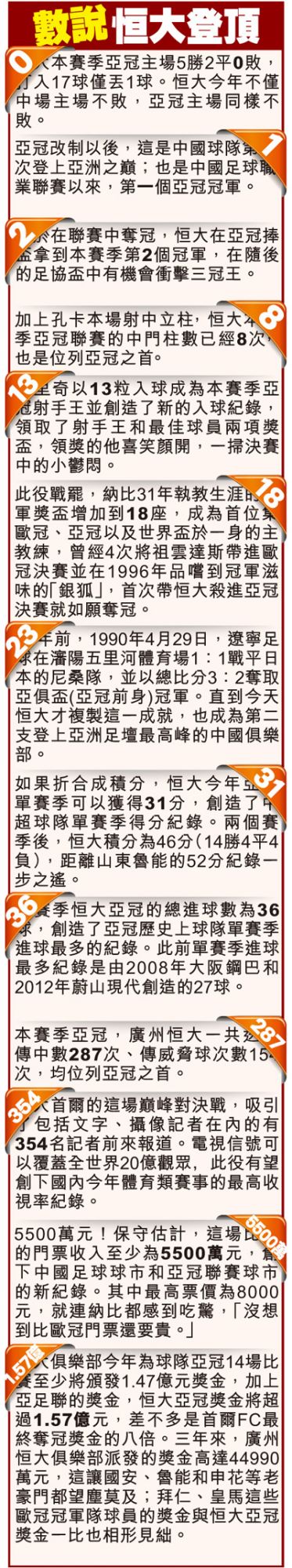广州塔9日晚上特意变换成了红色,「广州必胜!」「恒大必胜!」的口号不断在广州塔塔身飘过。天河体育中心当晚也爆满,虽然现场主持人宣布到场观众为4.3万人,但整个体育场涌进了将近5万名热情的球迷,所有的球迷都身穿恒大红色球衣,全场一片中国红。